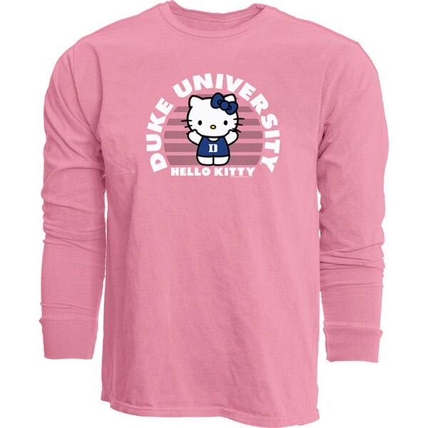 This adult long sleeve tee pairs Duke pride with Hello Kitty sweetness in a soft light pink design that shines with personality. Featuring the Duke University wordmark alongside Hello Kitty’s iconic face, it’s a playful yet polished way to rep your school spirit. Made from 100% ringspun cotton, it offers a smooth, comfortable fit perfect for layering or wearing solo. Ideal for fans who love a little charm with their collegiate style.