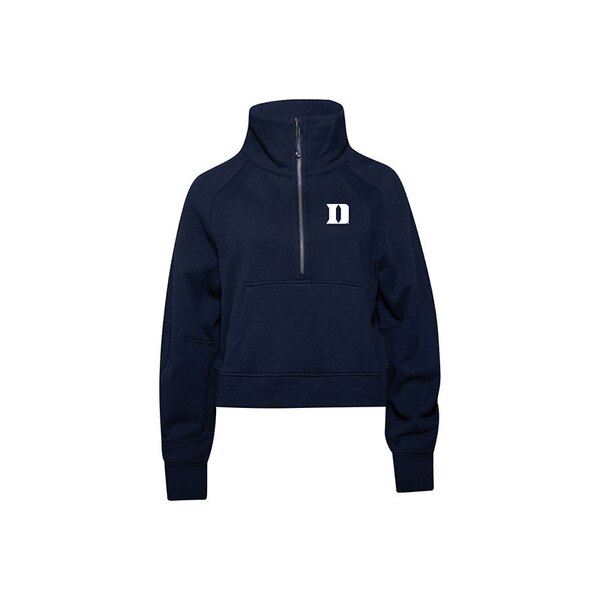 The Women’s Blue Devils Scuba Oversized Funnel Neck ½ zip by lululemon® in True Navy is designed for comfort, warmth, and effortless style. Featuring the iconic Iron Duke D logo on the left chest, this half-zip pullover blends school spirit with premium performance. Its naturally breathable fabric feels soft against the skin while offering lightweight warmth, making it perfect for layering or wearing solo. The exaggerated oversized fit provides a relaxed silhouette that’s roomy without being bulky, and the length hits just right around the waistband. A high funnel neck adds extra warmth, while thoughtful details like a zipper garage to prevent chafing and a kangaroo pocket with a hidden phone sleeve enhance everyday functionality. The elastic zipper pull even doubles as an emergency hair tie.